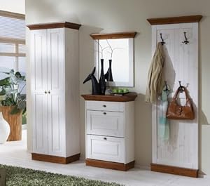 Diese representative Garderobe wird zum Highlight in Ihrem Eingangsbereich werden. Sie ist aus massivem Kiefernholz gefertigt und in sieben verschiedenen Farbvarianten erhältlich. Das Garderobenset besteht aus einem Kleiderschrank mit ausziehbarer Kleiderstange, einem Schuhschrank mit zwei Klapptüren und einem Schubkasten, einem Spiegel und einem Wandpaneel. Die Klapptüren des Schuhschranks verfügen über jeweils zwei Schuhfächer und bieten somit bis zu 12 Paar Schuhen Platz. Das Wandpaneel bieten mit vier Kleiderhaken ausreichend Platz für Jacken o.ä. Alle Teile können auch getrennt gestellt werden. Die Schubladen laufen auf Metallführungen.
